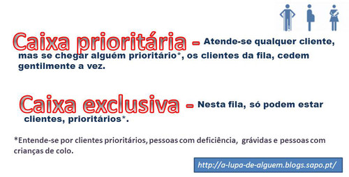 No final das contas as pessoas até estão dispostas a ceder a vez, mas se os prioritários o fazem abruptamente, a tendência é recusarem. E depois, esta regras são desconhecidas pela maioria pessoas ditas prioritárias , ( já que aqui há uns tempos passavam deliberadamente e pronto) e apesar de estarem no seu direito têm de pedir educadamente passagem. Eu sugeria que estivesse à entrada desta caixa, nem que fosse uma folha A4, com uma frase apelando às pessoas que são prioritárias, qualquer coisa do tipo: " se é/está prioritário, peça que lhe cedam a vez". Se calhar, esta frase não é bem explicita, mas deve de haver outra que explique melhor a situação.